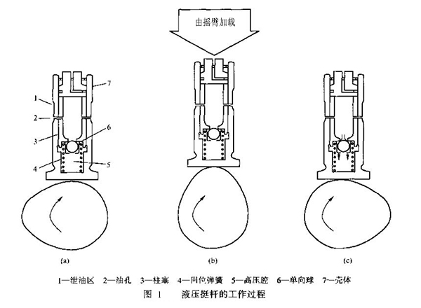 隨著凸輪的繼續轉動,挺桿殼體上的壓力降低,這是因為凸輪的凸部已經轉過挺桿。隨著油壓的降低,氣門在氣門彈簧的壓力作用下關閉,挺桿的柱塞和殼體也回到初始的位置。機構中的所有間隙再次被油壓消除。當挺桿到達圖1(c)所示的位置時,就已準備好重復以上工作循環。