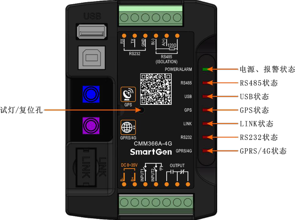 常滅:GPS 不使能; 常亮:GPS 未獲取到衛星信號; 閃爍:GPS 獲取到衛星信號。 |